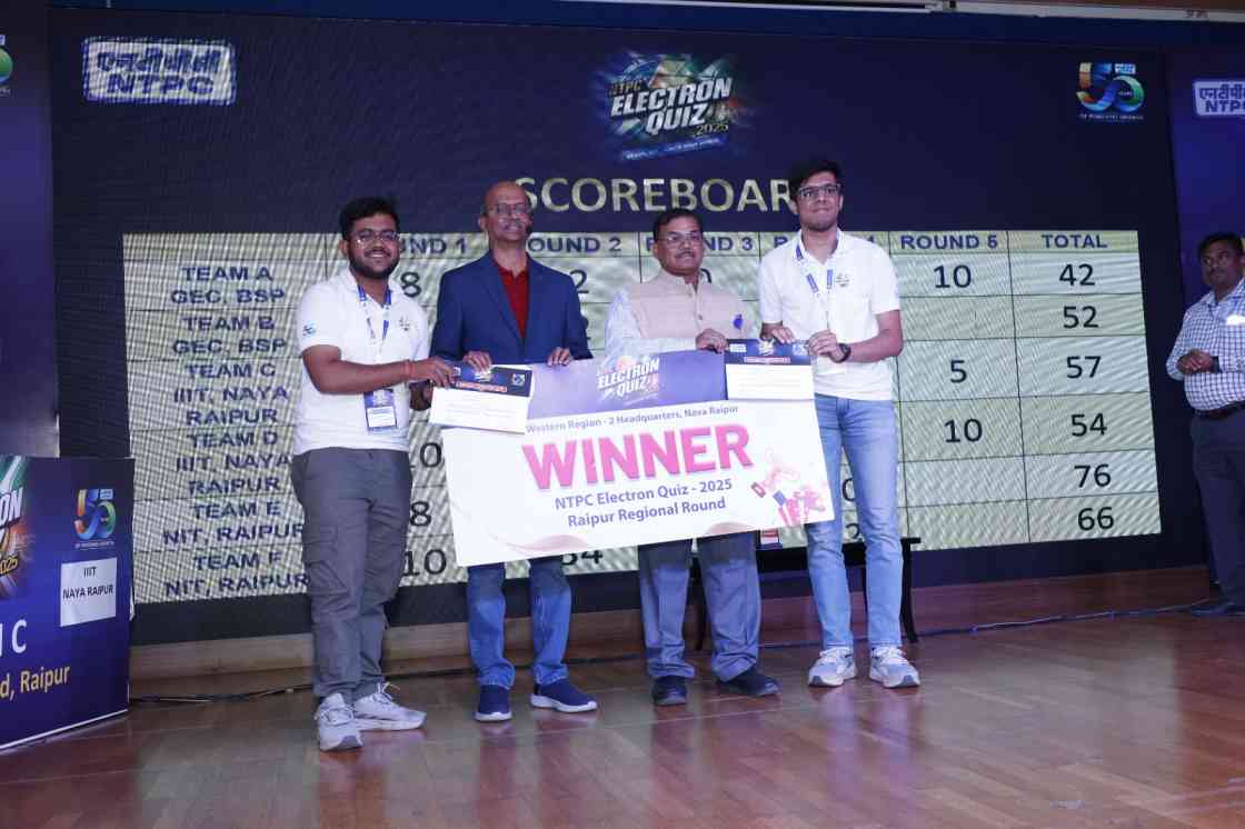 रायपुर। 24 फरवरी, 2025 को आयोजित एनटीपीसी इलेक्ट्रॉन क्विज-2025 रायपुर क्षेत्रीय दौर में एनआईटी रायपुर विजयी हुआ, जिसने प्रथम और द्वितीय स्थान प्राप्त किया, जबकि आईआईआईटी नया रायपुर ने तीसरा स्थान प्राप्त किया। एनटीपीसी नवा रायपुर द्वारा आयोजित इस क्विज में शीर्ष इंजीनियरिंग और प्रबंधन संस्थानों से भागीदारी देखी गई।