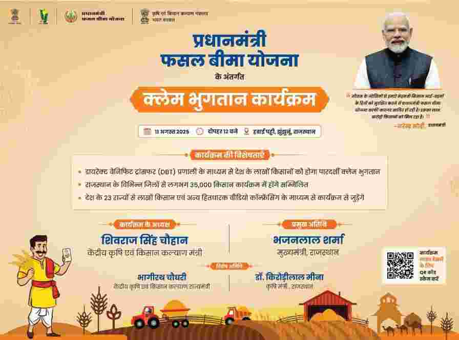 प्रधानमंत्री फसल बीमा योजना के अंतर्गत यह भुगतान 11 अगस्त 2025 (सोमवार) को राष्ट्रव्यापी प्रत्यक्ष लाभ हस्तांतरण आधारित स्वचालित प्रणाली के माध्यम से केंद्रीय कृषि एवं किसान कल्याण मंत्री श्री शिवराज सिंह चौहान की अध्यक्षता में राजस्थान के झुंझुनू में आयोजित कार्यक्रम में होगी। इस अवसर पर आयोजित कार्यक्रम के मुख्य अतिथि राजस्थान के मुख्यमंत्री श्री भजनलाल शर्मा होंगे। कार्यक्रम में केन्द्रीय कृषि एवं किसान कल्याण मंत्री श्री भागीरथ चौधरी, राजस्थान के कृषि मंत्री डॉ. किशोरी लाल मीना विशिष्ट अतिथि होंगे।