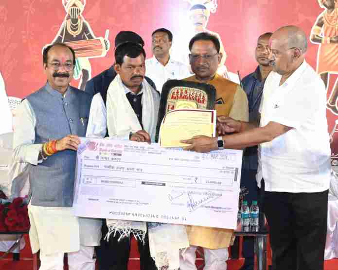 मुख्यमंत्री श्री साय ने जगार-2024 के शुभारंभ समारोह में राज्य के पांच सिद्धहस्त शिल्पियों को राज्य स्तरीय पुरस्कार वर्ष 2021-22 से सम्मानित किया। इनमें बेलमेटल शिल्पी सुंदरलाल झारा ग्राम एकताल पोस्ट नेतनगर, विकासखण्ड पुसौर जिला रायगढ़, समीप विश्वकर्मा लौह शिल्पी ग्राम किड़ईछेपड़ा (ड़ोगरीगुड़ा) पोस्ट पलारी जिला कोण्डागांव-बस्तर, मन्धर कश्यप काष्ठ शिल्पी ग्राम भोण्ड (पाण्डूपारा) पोस्ट लामकेर जिला बस्तर, बृहस्पति जायसवाल गोदना शिल्पी ग्राम मुनगाडीह पोस्ट पाली जिला कोरबा और बाबी सोनवानी भित्तीचित्र शिल्पी ग्राम सिरकोतंगा पोस्ट लहपटरा विकासखण्ड लखनपुर जिला सरगुजा को साल, श्रीफल, प्रमाण-पत्र, स्मृति चिन्ह और 25-25 हजार रूपए का चेक प्रदान कर सम्मानित किया। इस अवसर पर अतिथियों द्वारा सिद्धहस्त शिल्पियों को प्रदान किए गए राज्य स्तरीय पुरस्कार की स्मारिका का विमोचन भी किया गया।