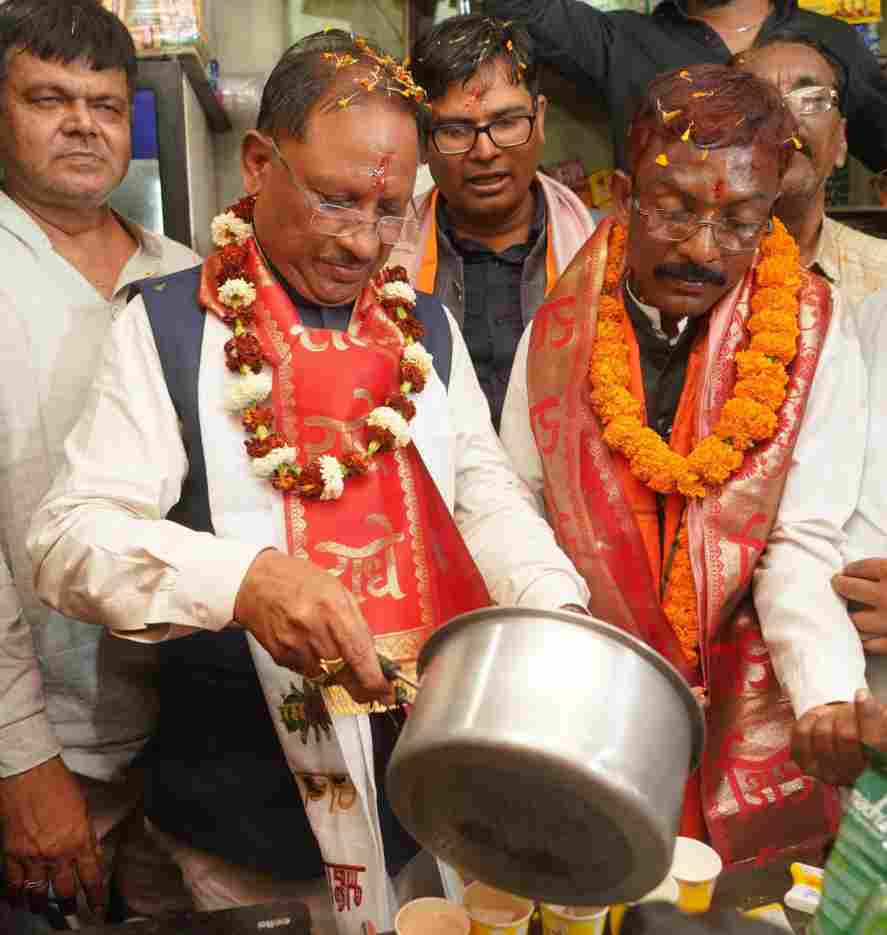 मुख्यमंत्री विष्णु देव साय नगरीय निकाय चुनाव प्रचार अभियान के तहत आज रायगढ़ पहुंचे, जहाँ उन्होंने पांच किलोमीटर से ज्यादा रोड शो किया। जहाँ विशाल जनसैलाब उमड़ पड़ा। इसके बाद श्री साय कैबिनेट के साथी, वित्त मंत्री ओपी चौधरी एवं कार्यकर्ताओं के हुजूम के साथ मिनीमाता चौक स्थित जीवर्धन चौहान की चाय दुकान पर पहुंचे। लोगों के आश्चर्य का उस समय ठिकाना न रहा, जब सीएम साय जीवर्धन की दुकान पर स्वयं चाय बनाने लगे। उन्होंने लोगों को चाय का वितरण भी किया और बोले – एक साधारण से कार्यकर्ता की मेहनत का उचित सम्मान, यह भारतीय जनता पार्टी में ही संभव है। जिस प्रकार चाय बेचने वाले श्री नरेंद्र मोदी जी आज देश के प्रधानमंत्री और दुनिया के सर्वाधिक लोकप्रिय नेता हैं, ठीक उसी तरह भाजपा के कर्मठ कार्यकर्ता, चाय बेचकर अपना जीविकोपार्जन करने वाले, महापौर प्रत्याशी जीवर्धन भाई भी जनता के आशीर्वाद से रायगढ़ के महापौर बनेंगे, यहाँ का सर्वांगीण विकास करेंगे।