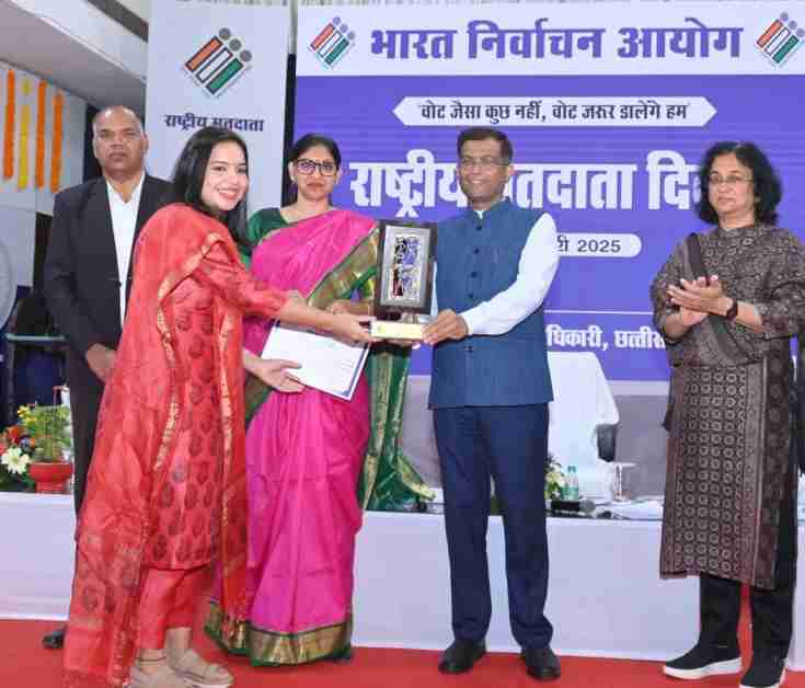मतदाता दिवस के अवसर पर उपस्थित सभी लोगों को मतदाता शपथ दिलाई गई। कार्यक्रम में नव मतदाताओं, सर्विस वोटरों और निर्वाचन कार्यों में उल्लेखनीय योगदान देने वाले अधिकारियों-कर्मचारियों को सम्मानित किया गया। रायगढ़ कलेक्टर श्री कार्तिकेय गोयल को प्रदेश में लोकसभा निर्वाचन 2024 में सर्वाधिक 81.66 प्रतिशत मतदान कराए जाने, दुर्ग कलेक्टर सुश्री ऋचा प्रकाश चौधरी को शहरी क्षेत्र होने के बावजूद विगत लोकसभा चुनाव की तुलना में वर्ष 2024 में लोकसभा निर्वाचन में मतदान प्रतिशत में 2.48 प्रतिशत वृद्धि, दंतेवाड़ा कलेक्टर श्री मयंक चतुर्वेदी को धुर नक्सल प्रभावित क्षेत्र होते हुए भी विगत लोकसभा निर्वाचन की तुलना में लोकसभा निर्वाचन 2024 में 10.39 प्रतिशत वृद्धि के लिए उत्कृष्ट जिला निर्वाचन अधिकारी के रूप में सम्मानित किया गया। रायपुर कलेक्टर श्री गौरव कुमार सिंह को लोकसभा निर्वाचन 2024 के दौरान मतदान दलों का प्रशिक्षण कार्य उत्कृष्ट तरीके से संपन्न कराने, राजनांदगांव जिले की मुख्य निर्वाचन पदाधिकारी सुश्री सुरुचि सिंह को गुणवत्ता पूर्ण स्वीप गतिविधियां आयोजित करने और मुंगेली जिले के जिला पंचायत मुख्य कार्यपालन अधिकारी श्री प्रभाकर पांडे को प्रवासी मजदूरों को मतदान के लिए प्रेरित करने संबंधी स्वीप गतिविधियों के लिए स्पेशल अवार्ड से सम्मानित किया गया।