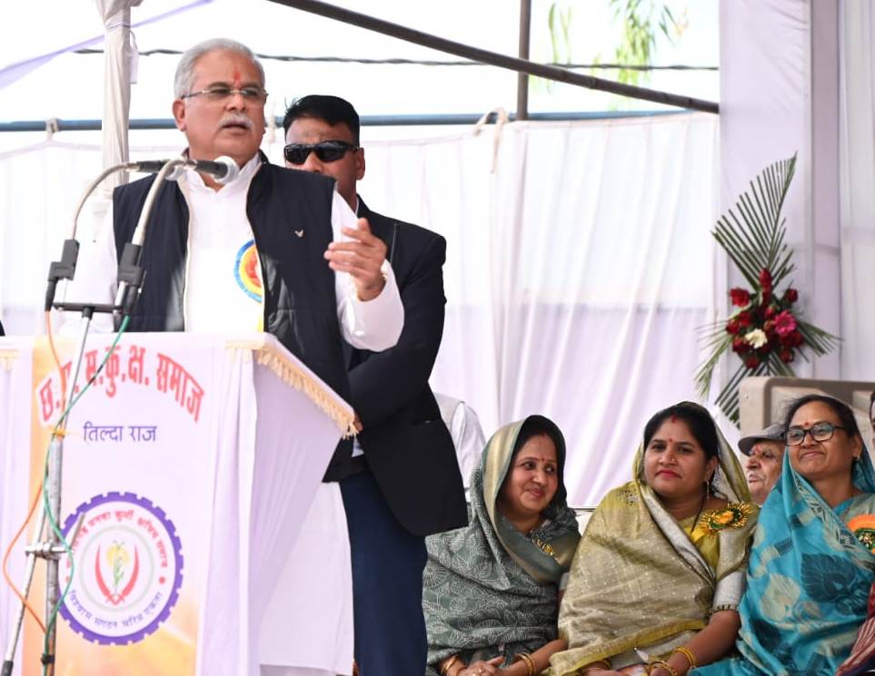 रायपुर.मुख्यमंत्री श्री भूपेश बघेल आज रायपुर जिले के तिल्दा विकासखण्ड के रायखेड़ा में आयोजित छत्तीसगढ़ मनवा कुर्मी क्षत्रिय समाज के 77 वें राज अधिवेशन में शामिल हुए। मुख्यमंत्री श्री बघेल ने इस अवसर पर कहा कि समाज के विकास में सबकी भागीदारी जरूरी है। इससे समाज में एकता और संगठन का विकास होता है। सभी के एक होने से समाज में सामाजिक समरसता का विकास होगा। समाज के बिना हम सब अधूरे है। मुख्यमंत्री श्री बघेल ने कहा कि संगठित समाज ही विकास की धारा में आगे बढ़ता है। मुख्यमंत्री ने इस अवसर पर ग्राम रायखेडा के बंधवा तालाब के सौंदर्यीकरण के लिए 50 लाख रुपए, ग्राम रायखेड़ा से देवगांव के लिए 4 किलोमीटर सड़क निर्माण और गांव में स्वामी आत्मानंद उत्कृष्ट अंग्रेजी माध्यम स्कूल खोलने की घोषणा की।