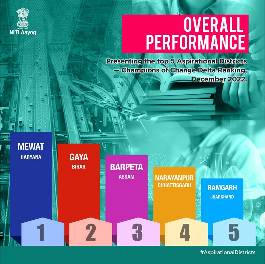 भारत सरकार के नीति आयोग की ओर से आकांक्षी जिलों को लेकर रिपोर्ट जारी की जाती है। इसी कड़ी में दिसम्बर 2022 के लिए जारी की गयी चैम्पियन ऑफ चेंज डेल्टा रैंकिंग में छत्तीसगढ़ के नारायणपुर जिले का परफॉर्मेंस बेहतर रहा है। देश में घोषित 112 आकांक्षी जिलों में से ओवरऑल परफॉर्मेंस श्रेणी में शीर्ष पांच जिलों में छत्तीसगढ़ के आकांक्षी जिलों में शामिल नारायणपुर जिला चौथे स्थान पर है। वहीं स्वास्थ्य और पोषण श्रेणी में नारायणपुर जिले का स्थान तीसरा है।