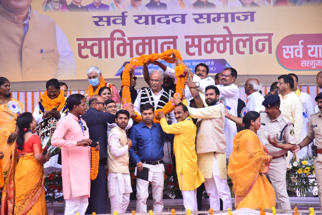 महासम्मेलन में मुख्यमंत्री श्री बघेल ने सर्व यादव समाज सरगुजा द्वारा आयोजित स्वाभिमान सम्मेलन के भव्य आयोजन की बधाई एवं शुभकामनाएं दी। उन्होंने सभा को संबोधित करते हुए कहा कि सर्व यादव समाज का इतिहास में महत्वपूर्ण योगदान रहा है। भगवान श्री कृष्ण जिन्होंने गीता जैसा महान ग्रंथ इस दुनिया को दिया, यादव समाज उनके वंशज हैं। उन्होंने कहा कि यादव समाज का प्रेम और सौहार्द्र से सरगुजा और पूरे प्रदेश की उन्नति और प्रगति में सहयोग बना रहे। उन्होंने कहा कि छत्तीसगढ़ शासन प्रदेश वासियों की प्रगति के लिए निरंतर कार्य कर रहा है। हमने इस वर्ष फैसला किया है कि समर्थन मूल्य में 20 क्विंटल प्रति एकड़ धान की खरीदी की जाएगी। यादव समाज गौ-माता के सेवक रहे हैं। इसी तरह छत्तीसगढ़ शासन भी गोधन न्याय योजना और नरवा, गरवा, घुरवा और बाड़ी जैसी योजनाओं के माध्यम से गौ सेवा कर रही है। इन योजनाओं से गौपालकों को भी फायदा हो रहा है। उन्होंने कहा कि जिस तरह आदिवासी समुदाय जल, जंगल और जमीन से जुड़ा हुआ है, उसी तरह वनांचलों में यादव समाज के लोग भी कई वर्षों से बसे हुए हैं।