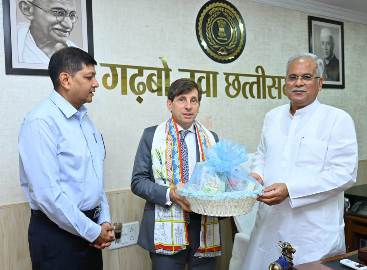मुख्यमंत्री श्री भूपेश बघेल से आज यहां उनके निवास कार्यालय में फ्रांस के कौंसल जनरल श्री जीन-मार्क सेरे-शार्लेट ने सौजन्य मुलाकात की। मुख्यमंत्री श्री बघेल ने इस दौरान कौंसल जनरल को छत्तीसगढ़ हर्बल उत्पाद, राजकीय गमछा और राजकीय पशु ’वनभैंसा’ का बेलमेटल से निर्मित प्रतीक चिन्ह भेंट किया। इस अवसर पर मुख्य सचिव श्री अमिताभ जैन भी उपस्थित थे।
