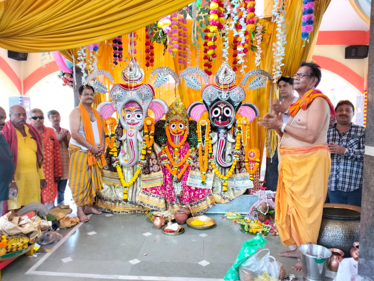 श्री जगन्नाथ मंदिर सेक्टर-4 में प्रतिवर्षानुसार इस वर्ष भी महाप्रभु श्री जगन्नाथ स्वामी जी की 54 वीं रथयात्रा महोत्सव 2023 मनाने जा रही है। रथयात्रा की पहली कड़ी के रुप में आज श्री जगन्नाथ मंदिर सेक्टर-4 में देवस्नान पूर्णीमा का धार्मिक आयोजन संपन्न हुआ। इस आयोजन के तहत महाप्रभु को बाजे-गाजे के साथ पहंडी करते हुए मंदिर से निकाल कर देव स्नान मंडप पर लाया गया। देव स्नान मंडप में समस्त विधि-विधान के साथ महाप्रभु श्री जगन्नाथ स्वामी, बड़े भाई भगवान श्री बलभद्र देव, तथा बहन माता सुभद्रा को सुगंधित जल से स्नान कराया गया। देव स्नान की यह धार्मिक पूजा समस्त रीति-रिवाजों के साथ पुरोहित पितवास पाढ़ी तथा पंडित सीमांचल रथ, सरोज दास, प्रकाश दास, रंजन महापात्र द्वारा संपन्न्न किया गया। देव स्नान के पश्चात महाप्रभु का गजराज भेष के रूप में श्रृंगार किया गया ।