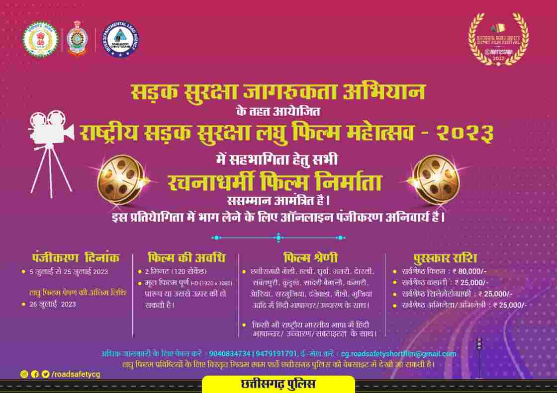 रायपुर, 11 जुलाई 2023| छत्तीसगढ़ पुलिस द्वारा सड़क सुरक्षा अभियान चलाया जा रहा है। इसके अंतर्गत अब लघु फिल्मों के जरिए भी जन जागरूकता के प्रयास किए जाएंगे। इसके लिए प्रदेश के रचनाधर्मी लोगों को सड़क सुरक्षा पर लघु फिल्म बनाने के लिए प्रेरित करते हुए राष्ट्रीय सड़क सुरक्षा लघु फिल्म महोत्सव 2023 के अंतर्गत प्रविष्टियां आमंत्रित की गई हैं।