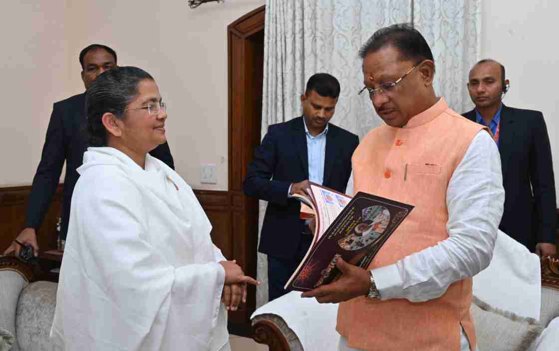 रायपुर. 17 दिसम्बर 2023। मुख्यमंत्री विष्णु देव साय से आज राज्य अतिथि गृह पहुंना में प्रजापिता ब्रह्माकुमारी ईश्वरीय विश्वविद्यालय की ब्रह्माकुमारी सविता बहन और सोमनाथ भाई सहित अन्य बहनों ने सौजन्य मुलाकात की। ब्रह्माकुमारी सविता ने मुख्यमंत्री का तिलक कर मुंह मीठा कराकर बधाई और शुभकामना दी। उन्होंने मुख्यमंत्री श्री साव और विधानसभा के सभी सदस्यों को राजस्थान के माउंट आबू स्थित संस्था के अंतरराष्ट्रीय मुख्यालय में आमंत्रित किया। मुख्यमंत्री को उन्होंने प्रजापिता ब्रह्माकुमारी ईश्वरीय विश्वविद्यालय के गतिविधियों की भी जानकारी दी।