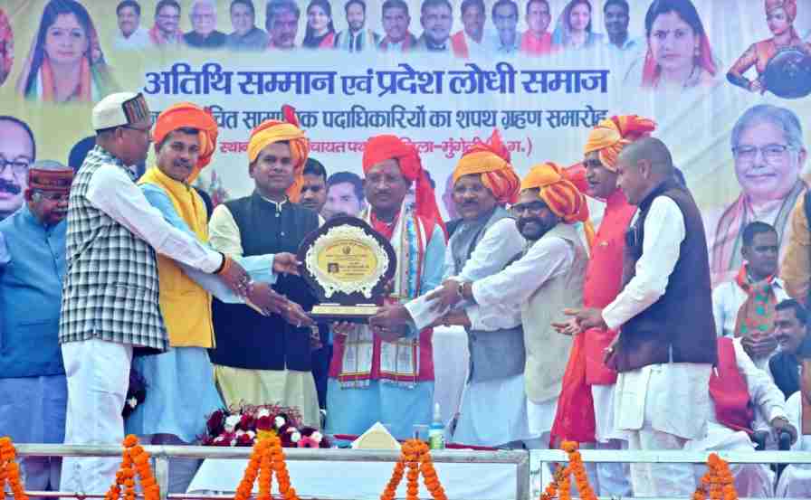 रायपुर। मुख्यमंत्री विष्णु देव साय आज अपने मुंगेली प्रवास के दौरान नगर पंचायत पथरिया में छत्तीसगढ़ राज्य लोधी समाज के शपथ ग्रहण एवं सम्मान समारोह में शामिल हुए। कार्यक्रम स्थल पर मुख्यमंत्री श्री साय का समाज के पदाधिकारियों द्वारा पगड़ी एवं गजमाला पहनाकर तथा समाज का प्रतीक चिन्ह भेंटकर आत्मीय स्वागत किया गया। इस दौरान उपमुख्यमंत्री श्री अरूण साव, स्कूल शिक्षा मंत्री श्री बृजमोहन अग्रवाल, आदिम जाति विकास मंत्री श्री रामविचार नेताम भी मौजूद रहे।