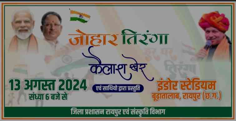 रायपुर। मुख्यमंत्री विष्णु देव साय के मार्गदर्शन में छत्तीसगढ़ राज्य में स्वतंत्रता दिवस के उपलक्ष्य में आयोजित हर घर तिरंगा अभियान के तहत 13 अगस्त को रायपुर के बूढ़ा तालाब स्थित इंडोर स्टेडियम में जोहार तिरंगा कार्यक्रम का आयोजन होगा। मुख्यमंत्री श्री विष्णु देव साय की उपस्थिति में यह कार्यक्रम संध्या 6 बजे से शुरू होगा।