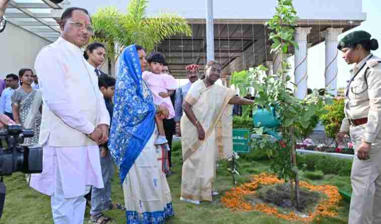 रायपुर। मुख्यमंत्री विष्णु देव साय के आमंत्रण पर उनके नवा रायपुर स्थित निवास पहुंची राष्ट्रपति श्रीमती द्रौपदी मुर्मू ने निवास परिसर में बेल का पौधा रोपा। उनके साथ राज्यपाल श्री रमेन डेका ने आंवला का पौधा रोपा। मुख्यमंत्री श्री विष्णु देव साय, मुख्यमंत्री की धर्मपत्नी श्रीमती कौशल्या देवी साय, उप मुख्यमंत्री श्री अरूण साव भी इस अवसर पर उपस्थित थे।