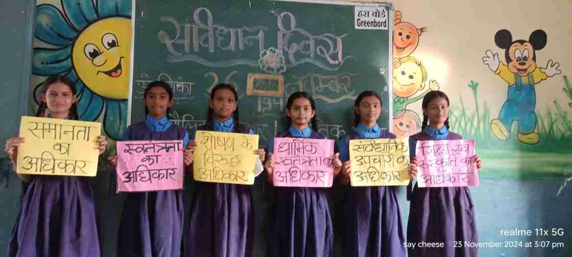 छात्रों द्वारा संविधान के प्रति अपने सम्मान को व्यक्त करते हुए शपथ लिया गया। संविधान ने हमें मौलिक अधिकार दिए हैं जो हमें सरल सहज जीवन यापन करने में सहायता प्रदान करते हैं। संविधान में दिए गए अधिकारों के साथ ही हमारे कुछ मौलिक कर्तव्य और दायित्व भी हैं। संविधान में दिए गए मौलिक कर्तव्य हमारी जिम्मेदारियां का एहसास करआते हैं। दायित्व का निर्वहन भी उतना ही आवश्यक है जितना अधिकारों का होना। साथ ही पशुओं से प्रेम करना राष्ट्रीय प्रतीकों का सम्मान करना, बड़े बुजुर्गों एवं निशक्तजनों की सेवा करना, परिवेश की स्वच्छता की भी जिम्मेदारी विद्यार्थियों और अन्य नागरिकों की है। पुलिस, अधिकारी, वकील, शिक्षक, पार्षद, पुजारी, छात्र आदि के व्यक्तित्व को आत्मसात करते हुए अभिनय का प्रदर्शन किया। हमारा संविधान हमारा स्वाभिमान के नारे लगाते हुए छात्रों ने संविधान दिवस मनाया।कार्यक्रम में संस्था प्रमुख सुमन लता वर्मा, संकुल समनवयक प्रशांत पांडे एवं शाला के सभी शिक्षकगण मौजूद थे।