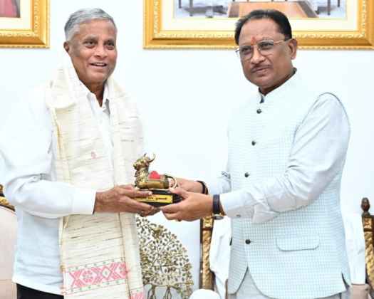 रायपुर। मुख्यमंत्री विष्णुदेव साय से आज शाम उनके निवास में छत्तीसगढ़ प्रवास पर आए केन्द्रीय रेल एवं जल शक्ति राज्य मंत्री श्री वी. सोमन्ना ने सौजन्य मुलाकात की। मुख्यमंत्री श्री साय ने श्री सोमन्ना का छत्तीसगढ़ में स्वागत करते हुए उन्हें बस्तर आर्ट का प्रतीक चिन्ह व शॉल भेंट की।