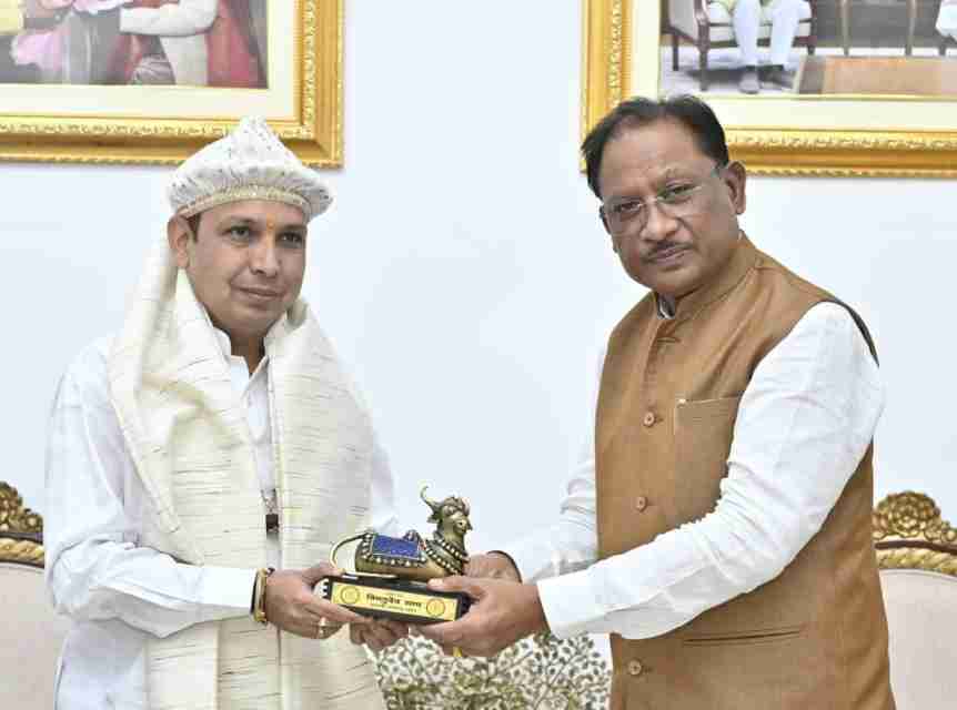 रायपुर। मुख्यमंत्री विष्णु देव साय से आज मुख्यमंत्री निवास कार्यालय में सिंधु अमरधाम तीर्थ, बिलासपुर के पीठाधीश्वर पूज्य संत श्री लालदास साहेब ने सौजन्य भेंट की। मुख्यमंत्री ने पूज्य संत श्री लालदास साहेब का शॉल, श्रीफल और स्मृति चिन्ह भेंट कर आत्मीय स्वागत किया।