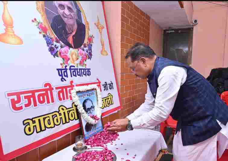 रायपुर। मुख्यमंत्री विष्णु देव साय आज राजधानी रायपुर के पुलिस लाइन स्थित रायपुर की पहली महिला विधायक एवं समाजसेवी स्वर्गीय श्रीमती रजनी ताई उपासने के निवास पहुँचे और उन्हें श्रद्धांजलि अर्पित की। उन्होंने रजनी ताई उपासने के योगदानों का पुण्य स्मरण किया तथा शोक संतप्त परिजनों से भेंट कर उन्हें सांत्वना दी। इस अवसर पर पूर्व राज्यसभा सांसद श्री कैलाश सोनी, श्री संतोष शर्मा, श्री जगदीश उपासने सहित परिजन उपस्थित थे।