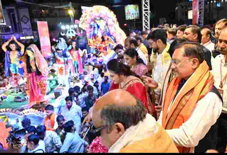रायपुर। मुख्यमंत्री विष्णु देव साय 8 सितंबर की देर रात राजधानी रायपुर के हृदयस्थल जयस्तंभ चौक स्थित नगर निगम द्वारा निर्मित स्वागत मंच पर पहुंचे और ऐतिहासिक गणेश विसर्जन यात्रा में शामिल होकर झांकियों का अभिनंदन किया। कार्यक्रम को संबोधित करते हुए उन्होंने कहा कि रायपुर की गणेश विसर्जन झांकी अत्यंत ऐतिहासिक परंपरा का प्रतीक है। इस अवसर पर उन्होंने विघ्नहर्ता श्री गणेश से छत्तीसगढ़ की खुशहाली और समृद्धि की कामना भी की। मुख्यमंत्री श्री साय ने ऐतिहासिक विसर्जन यात्रा में आमंत्रित करने के लिए आयोजकों के प्रति आभार व्यक्त किया।