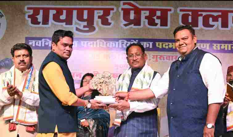 रायपुर। मुख्यमंत्री विष्णु देव साय रायपुर प्रेस क्लब द्वारा आयोजित नवनिर्वाचित पदाधिकारियों के शपथ-ग्रहण समारोह में शामिल हुए। इस अवसर पर उन्होंने प्रेस क्लब के नवनिर्वाचित अध्यक्ष श्री मोहन तिवारी सहित समस्त कार्यकारिणी को हार्दिक बधाई एवं शुभकामनाएं दीं।