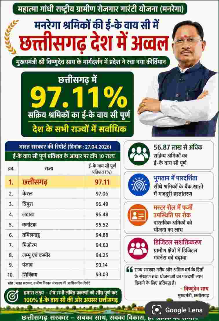 महात्मा गांधी राष्ट्रीय ग्रामीण रोजगार गारंटी योजना ;मनरेगा के तहत श्रमिकों की ई.केवाईसी (e-KYC) प्रक्रिया को पूरा करने में छत्तीसगढ़ ने देश भर में अग्रणी स्थान हासिल किया है। प्रदेश में लगभग 56.87 लाख से ज्यादा मजदूरों की डिजिटल वेरिफिकेशन (e-KYC) पूरी की गई है जो भुगतान में पारदर्शिता सुनिश्चित करती है। यह डिजिटल प्रक्रिया फर्जी जॉब कार्डों को हटाने और सीधे वास्तविक लाभार्थियों के बैंक खातों में मजदूरी पहुंचाने में मदद कर रही है।